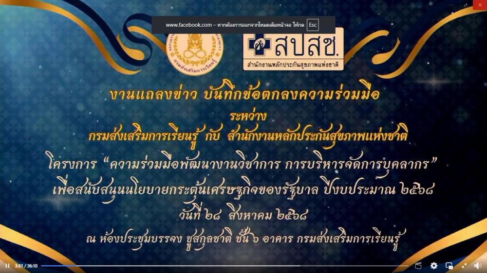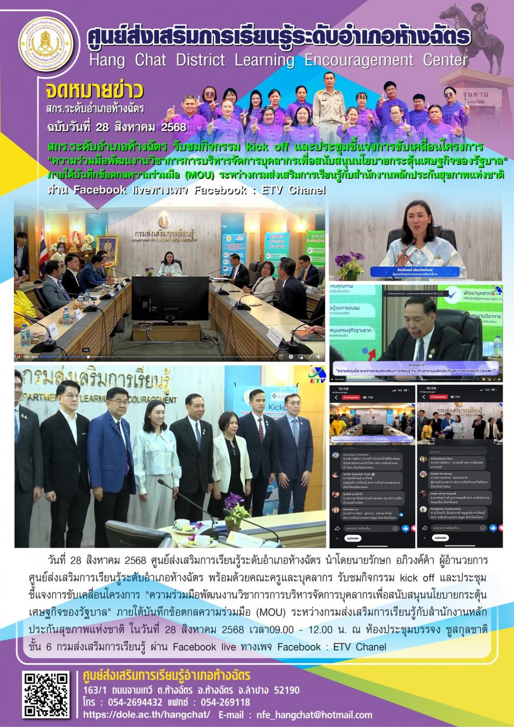 วันที่ 28 สิงหาคม 2568 ศูนย์ส่งเสริมการเรียนรู้ระดับอำเภอห้างฉัตร นำโดยนายรักษก อภิวงค์คำ ผู้อำนวยการ ศูนย์ส่งเสริมการเรียนรู้ระดับอำเภอห้างฉัตร พร้อมด้วยคณะครูและบุคลากร รับชมกิจกรรม kick off และประชุมชี้แจงการขับเคลื่อนโครงการ "ความร่วมมือพัฒนงานวิชาการการบริหารจัดการบุคลากรเพื่อสนับสนุนนโยบายกระตุ้นเศษฐกิจของรัฐบาล" ภายใต้บันทึกข้อตกลงความร่วมมือ (MOU) ระหว่างกรมส่งเสริมการเรียนรู้กับสำนักงานหลักประกันสุขภาพแห่งชาติ ในวันที่ 28 สิงหาคม 2568 เวลา 09.00 - 12.00 น. ณ ห้องประชุมบรรจง ซูสกุลชาติ ชั้น 6 กรมส่งเสริมการเรียนรู้ ผ่าน Facebook live ทางเพจ Facebook : ETV Chanel