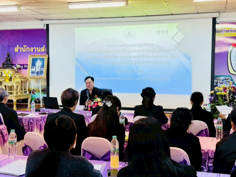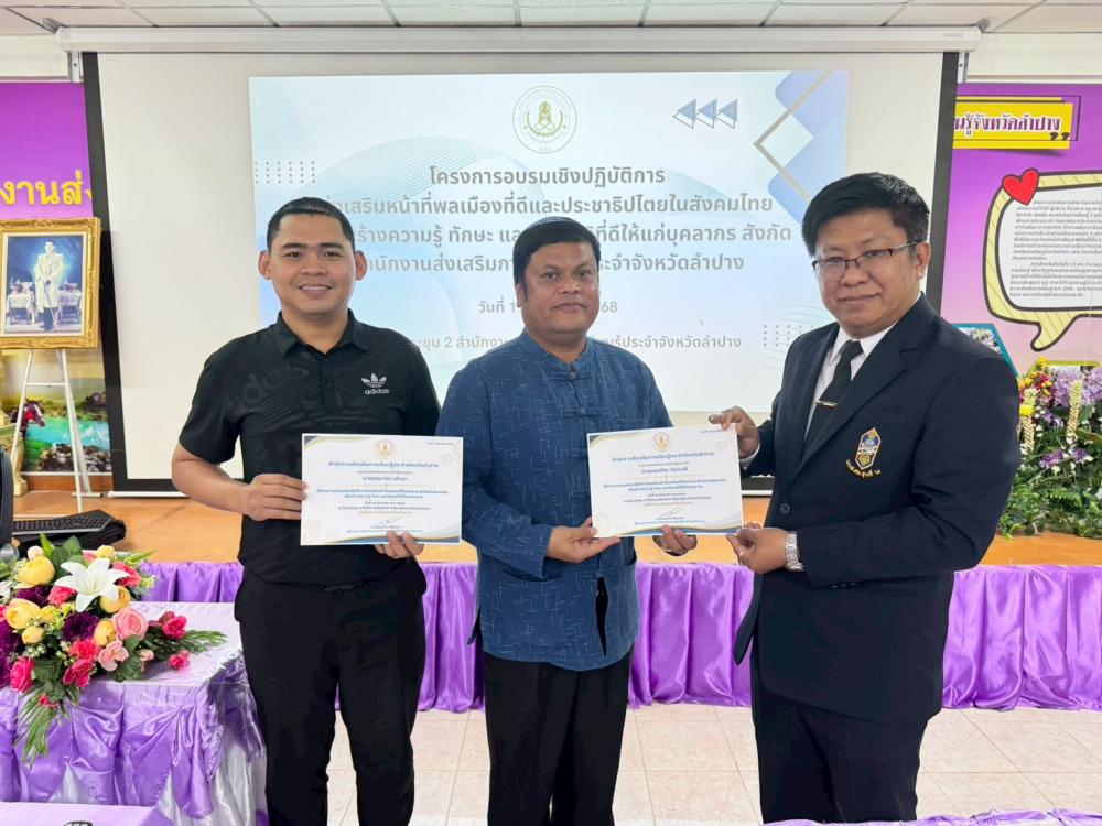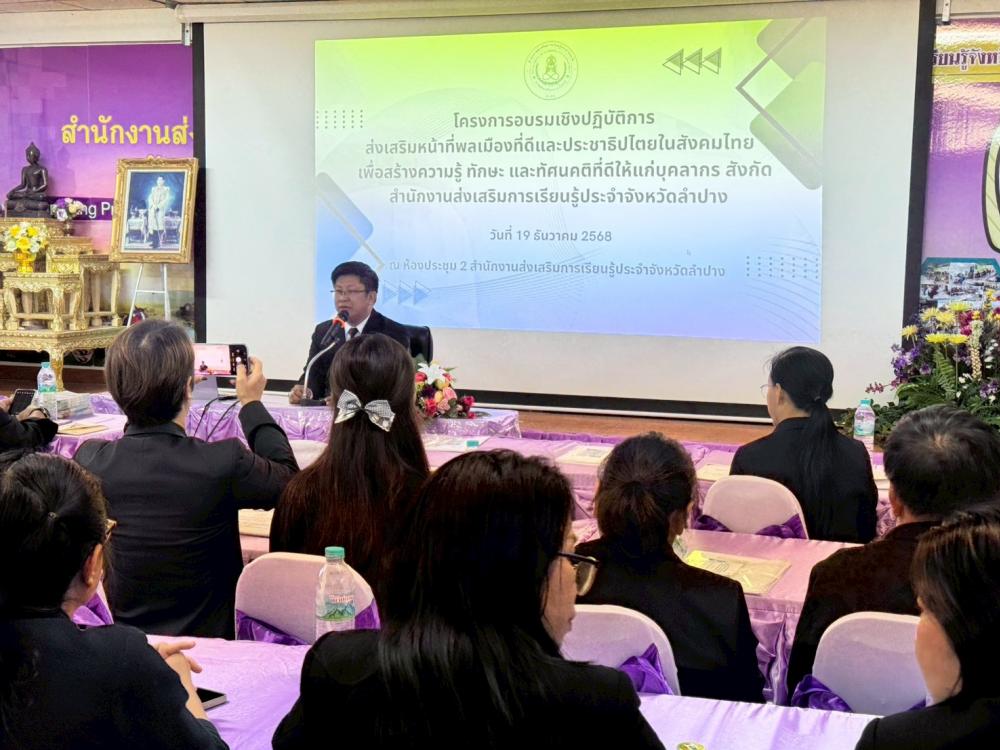 เข้ารับการอบรม ในโครงการอบรมเชิงปฏิบัติการส่งเสริมหน้าที่พลเมืองที่ดีและประชาธิปไตยในสังคมไทยเพื่อสร้างความรู้ ทักษะ และทัศนคติที่ดีให้แก่บุคลากร สังกัดสำนักงานส่งเสริมการเรียนรู้ประจำจังหวัดลำปาง