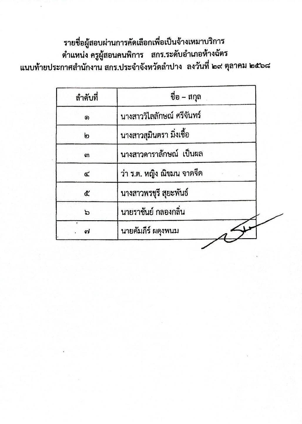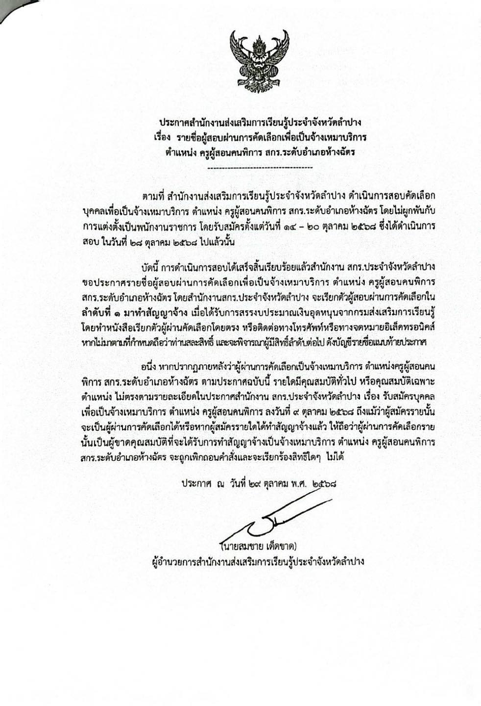 ประกาศรายชื่อผู้ผ่านการคัดเลือกเพื่อเป็นจ้างเหมาบริการ ตำแหน่ง ครูผู้สอนคนพิการ ศูนย์ส่งเสริมการเรียนรู้ระดับอำเภอห้างฉัตร