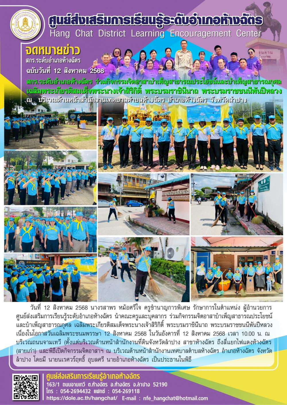 วันที่ 12 สิงหาคม 2568 นางรสาพร หม้อศรีใจ ครูชำนาญการพิเศษ รักษาการในตำแหน่ง ผู้อำนวยการ ศูนย์ส่งเสริมการเรียนรู้ระดับอำเภอห้างฉัตร นำคณะครูและบุคลากร ร่วมกิจกรรมจิตอาสาบำเพ็ญสาธารณประโยชน์และบำเพ็ญสาธารณกุศล เฉลิมพระเกียรติสมเด็จพระนางเจ้าสิริกิติ์ พระบรมราชินีนาถ พระบรมราชชนนีพันปีหลวง เนื่องในโอกาสวันเฉลิมพระชนมพรรษา 12 สิงหาคม 2568 ในวันอังคารที่ 12 สิงหาคม 2568 เวลา 10.00 น. ณ บริเวณถนนจามเทวี (ตั้งแต่บริเวณด้านหน้าสำนักงานที่ดินจังหวัดลำปาง สาขาห้างฉัตร ถึงสี่แยกไฟแดงห้างฉัตร (สายเก่า) และพิธีเปิดกิจกรรมจิตอาสาฯ ณ บริเวณด้านหน้าสำนักงานเทศบาลตำบลห้างฉัตร อำเภอห้างฉัตร จังหวัดลำปาง โดยมี นายนเรศวร์ฤทธิ์ อุบลศรี นายอำเภอห้างฉัตร เป็นประธานในพิธี